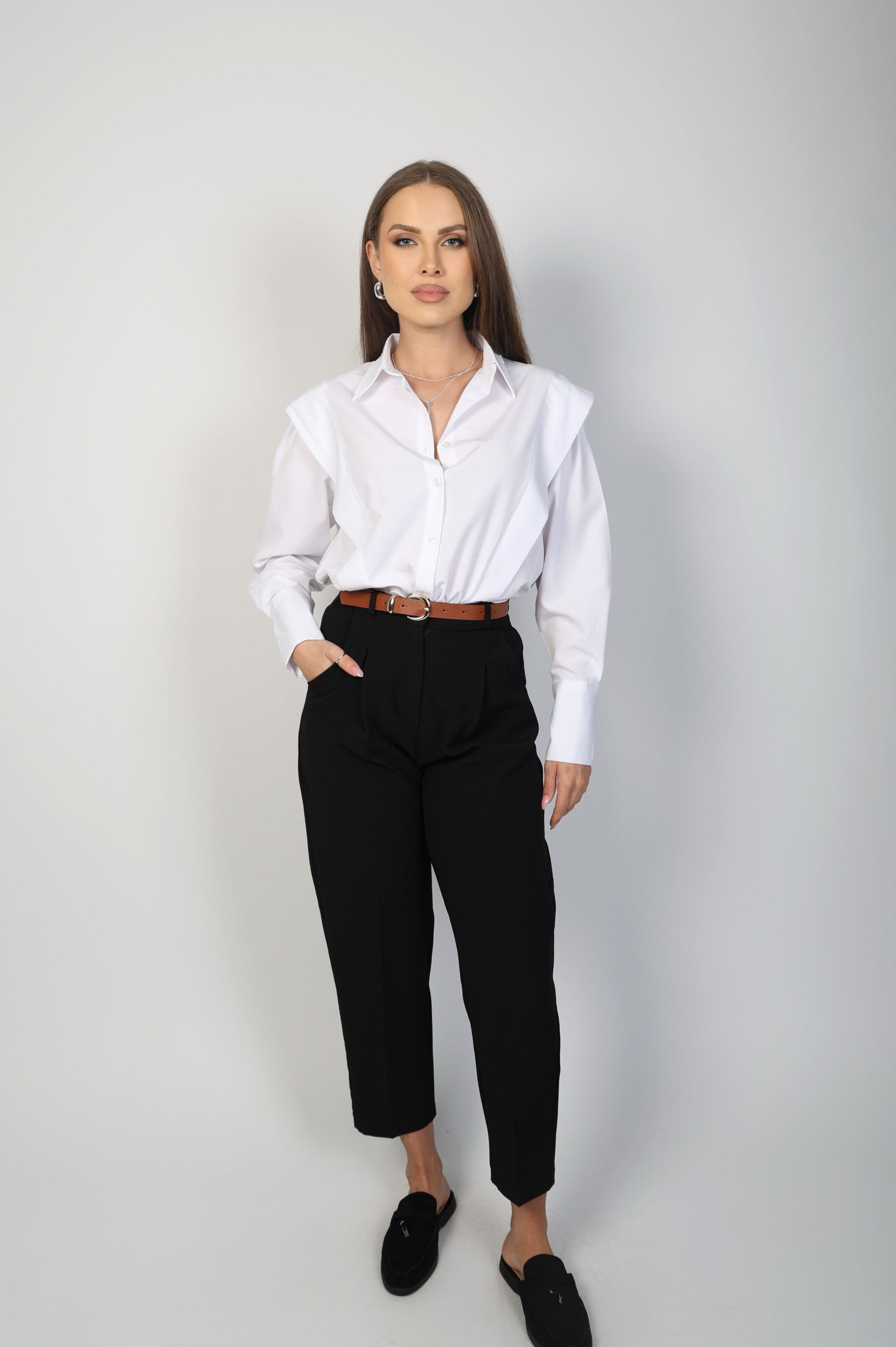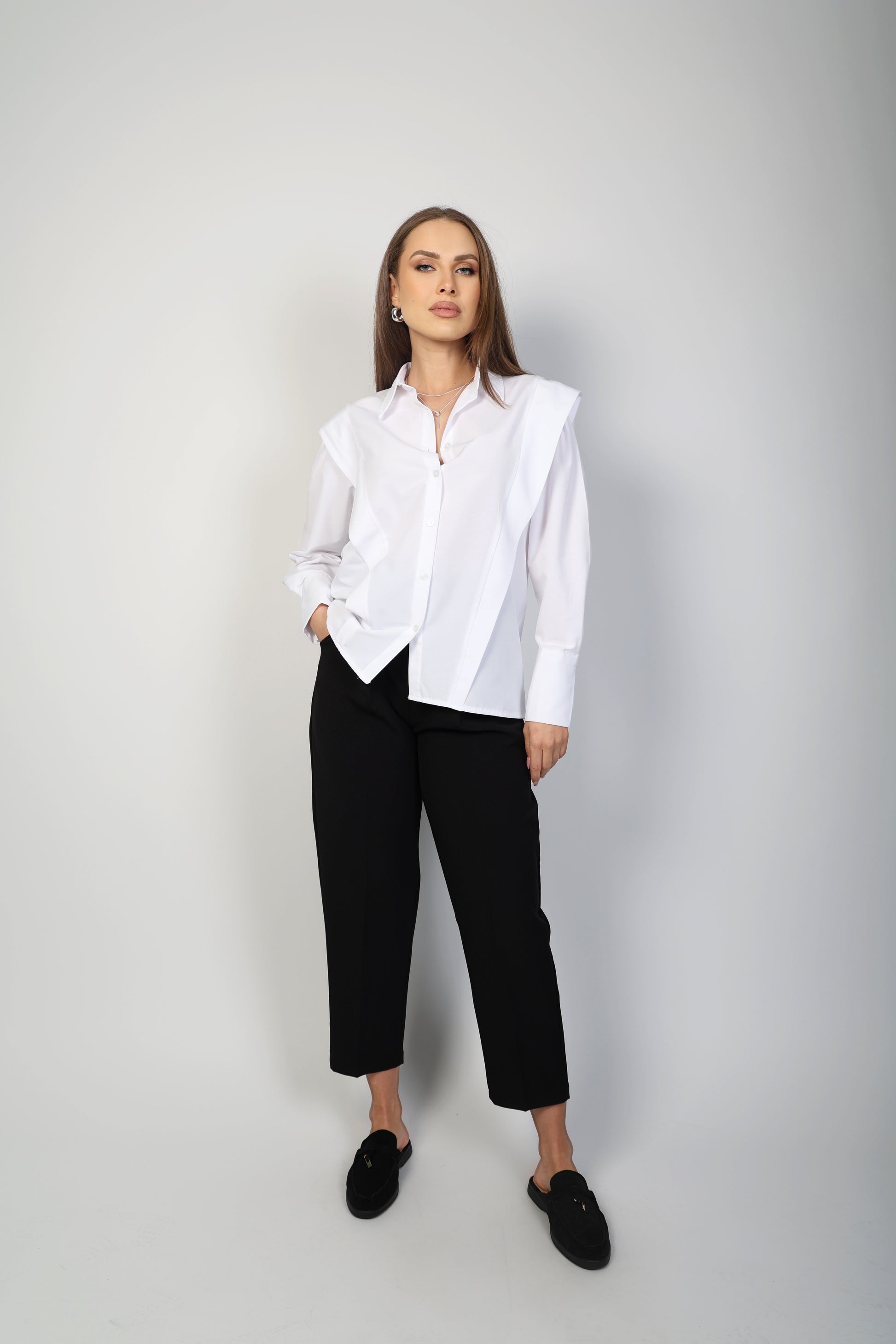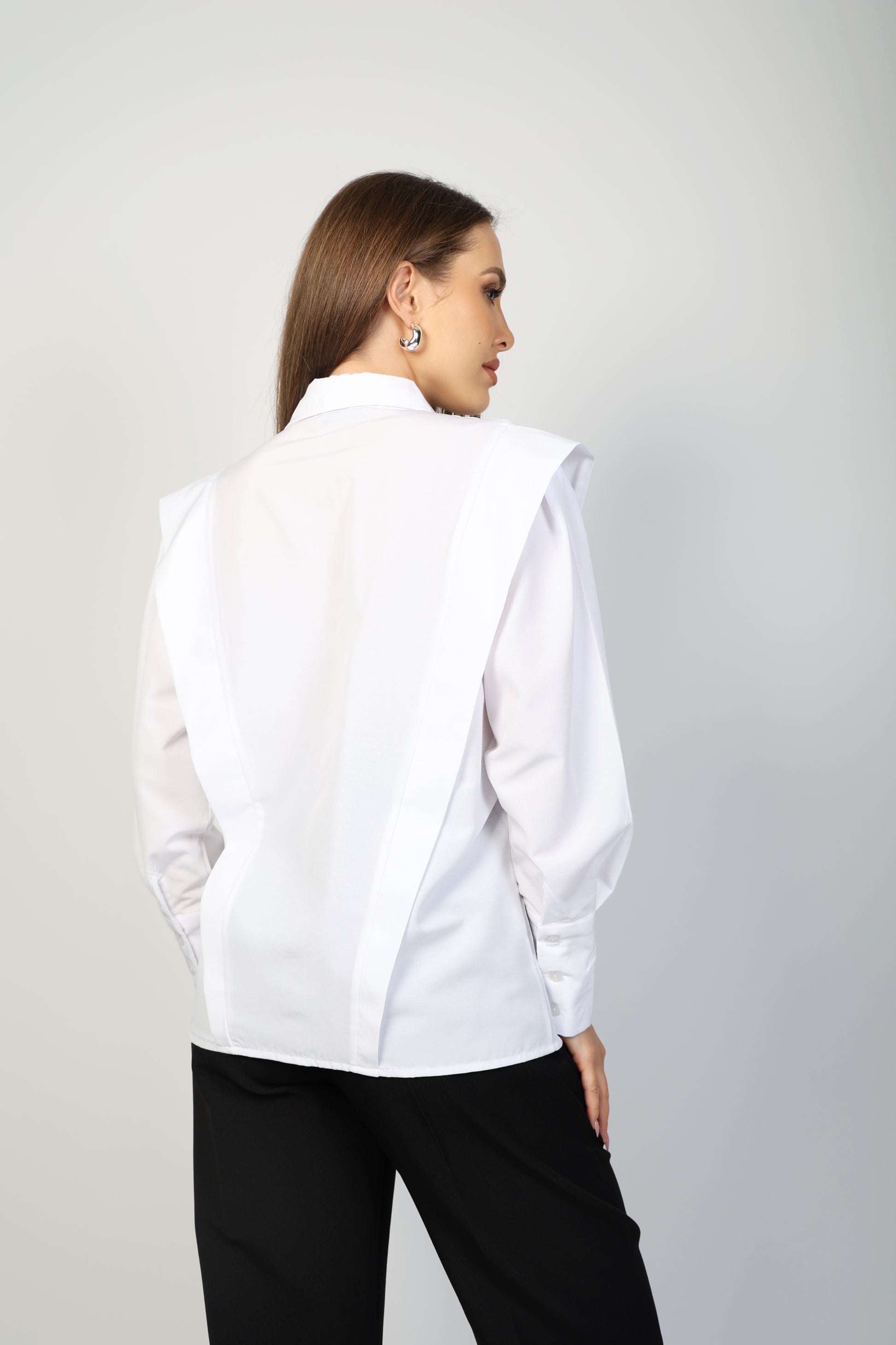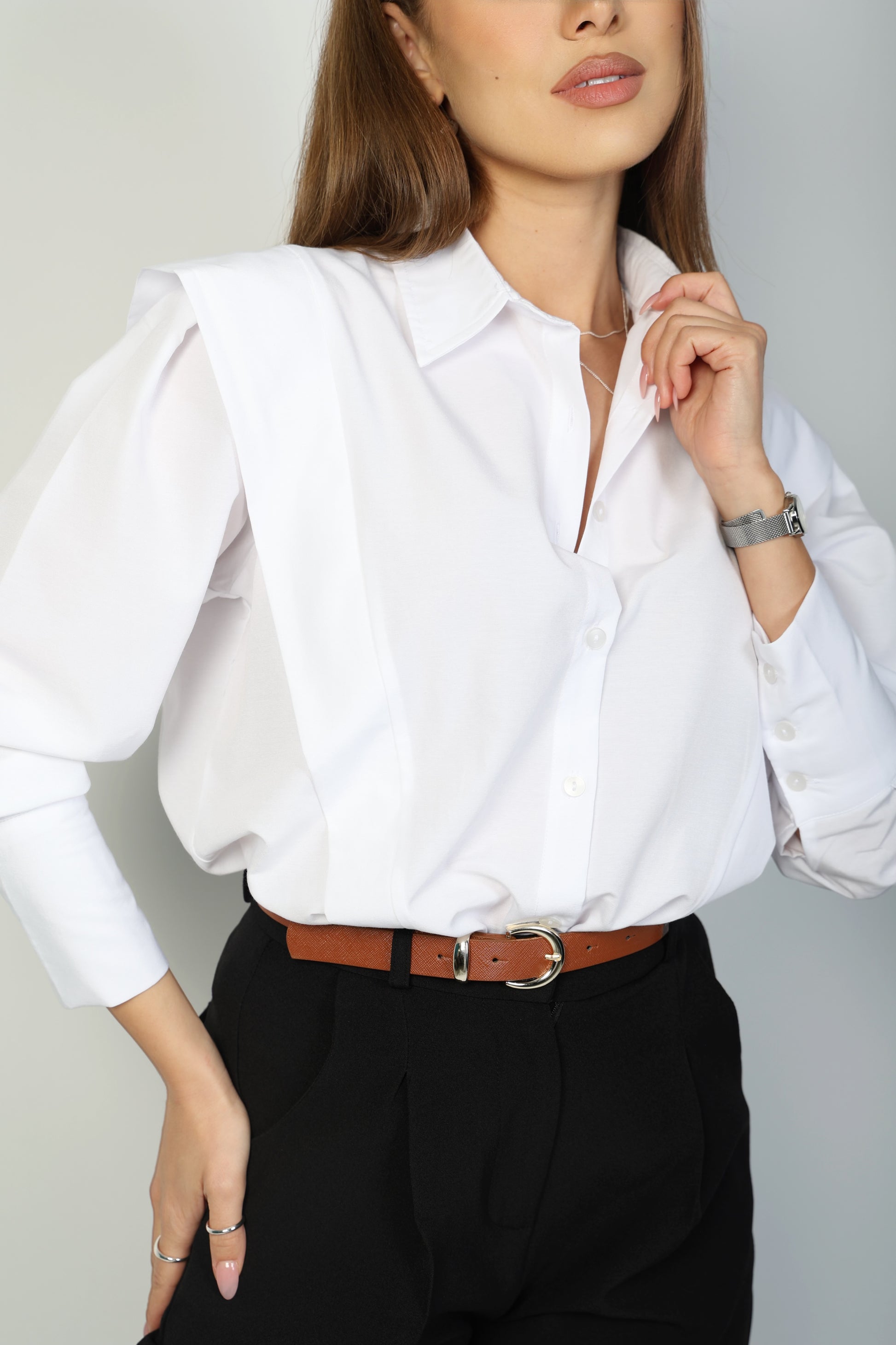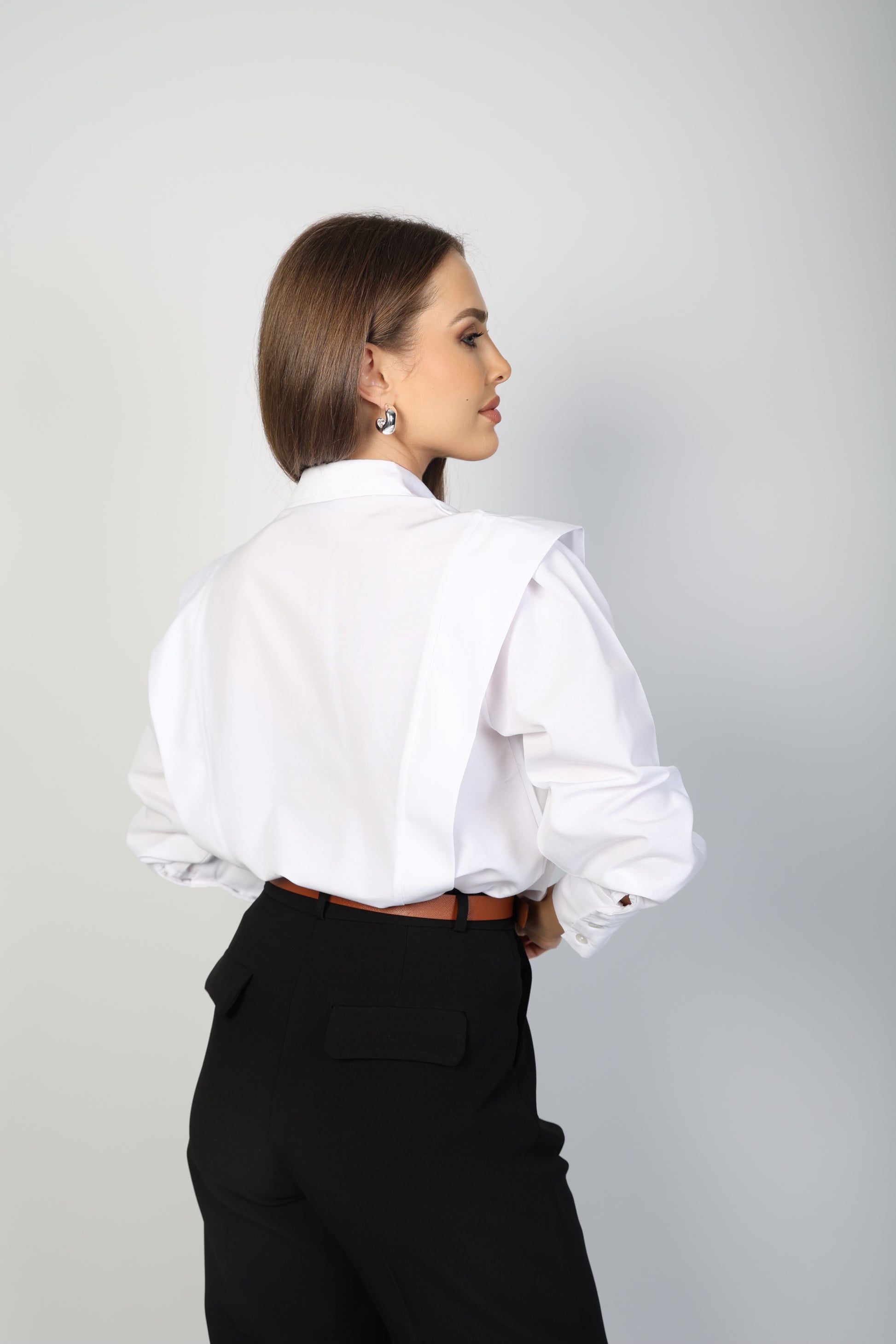 Avec sa coupe droite épurée et ses épaules graphiques, cette chemise blanche revisite les codes du tailoring avec audace. À la fois structurée et fluide, elle joue sur les volumes pour apporter une allure affirmée, moderne, et résolument mode. Le détail travaillé des épaules crée une ligne forte, tout en conservant un confort optimal grâce à sa matière 100% coton. À associer avec un pantalon ajusté ou un jean brut pour un contraste. parfaitement équilibré.