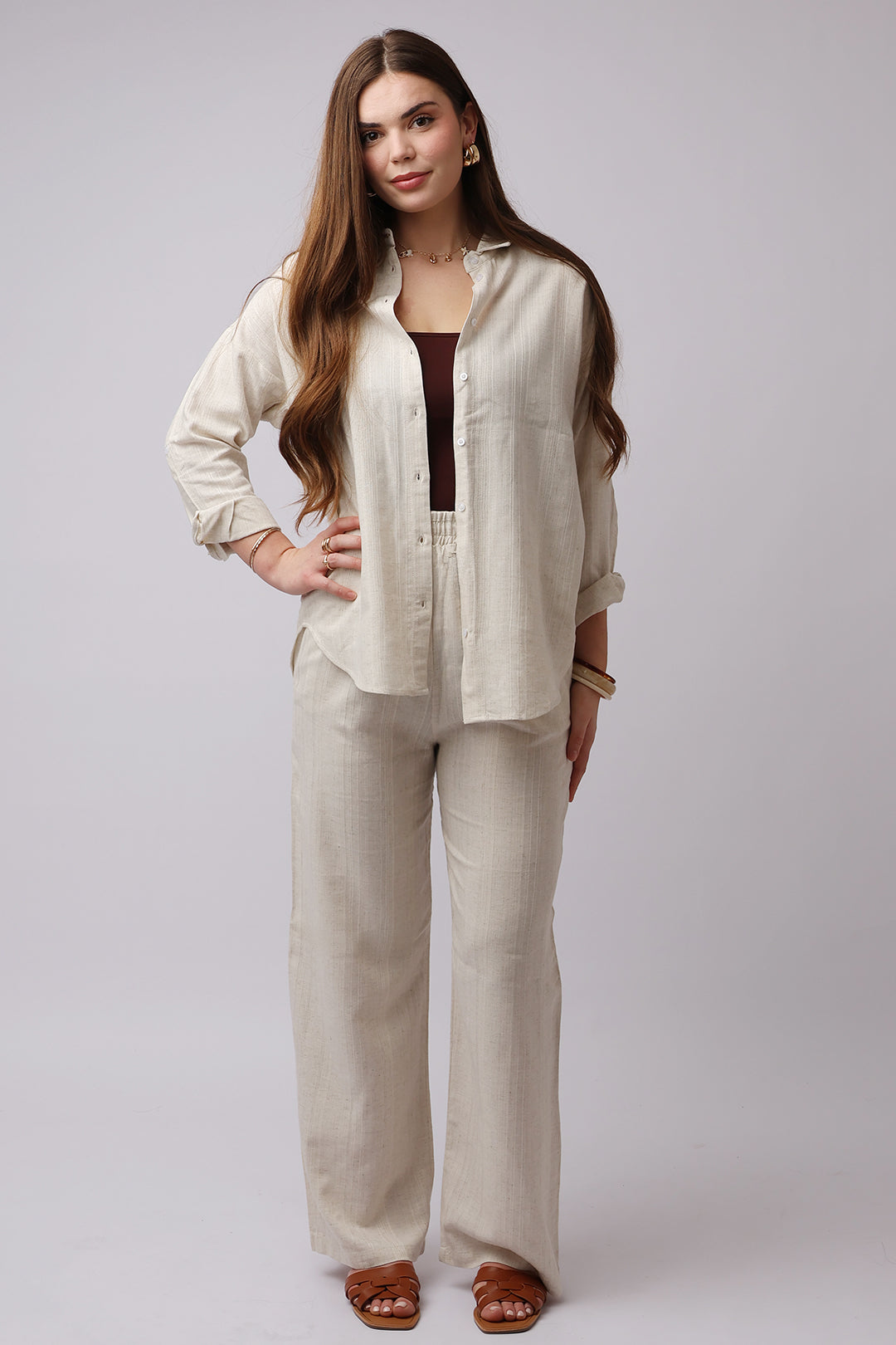 Subtil équilibre entre naturel et raffinement, cet ensemble en coton beige incarne une élégance libre. Composé d’une chemise fluide et d’un pantalon légèrement évasé, il dessine une silhouette souple, chic, et résolument décontractée. Parfait pour accueillir les journées ensolleilées avec légèreté.
