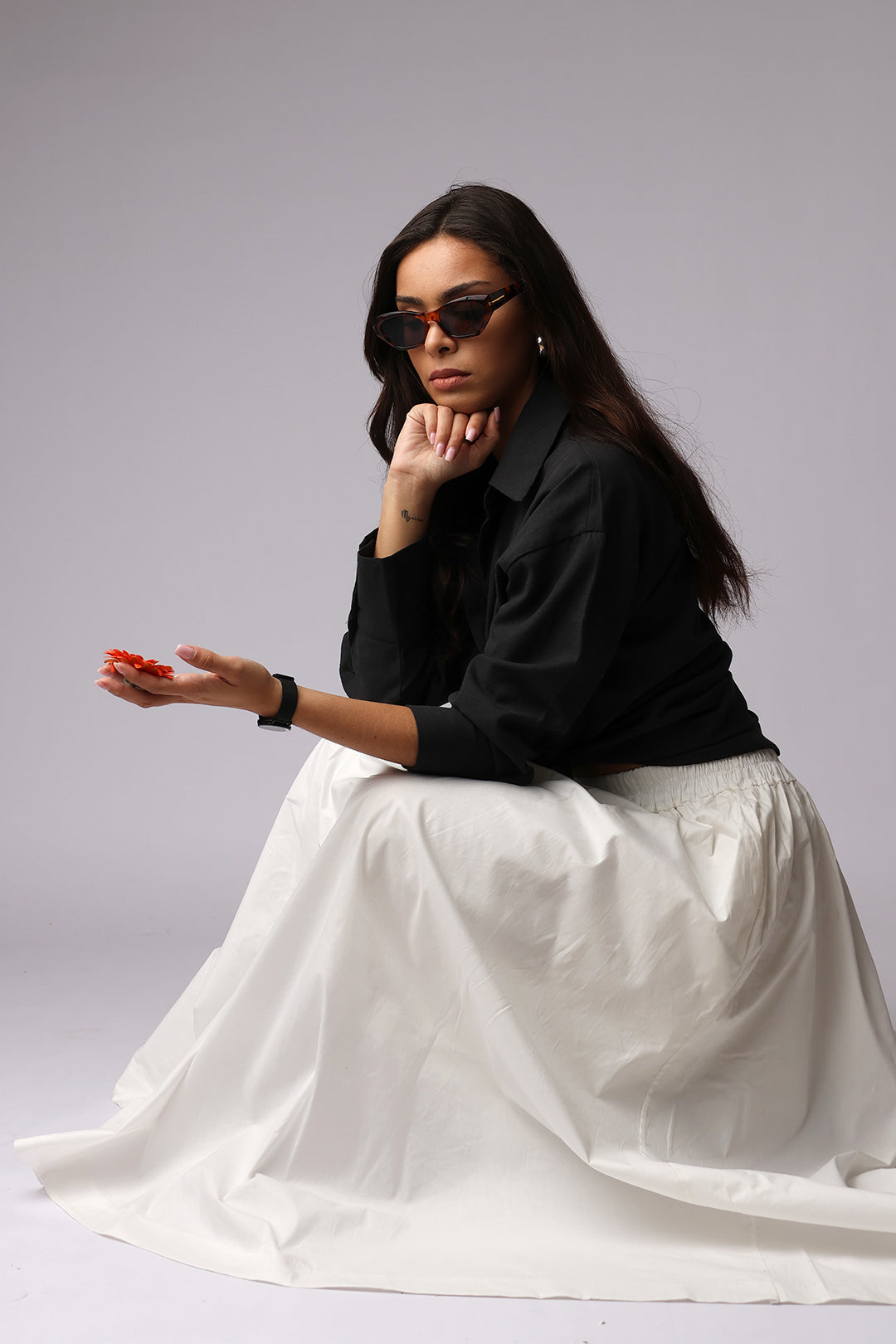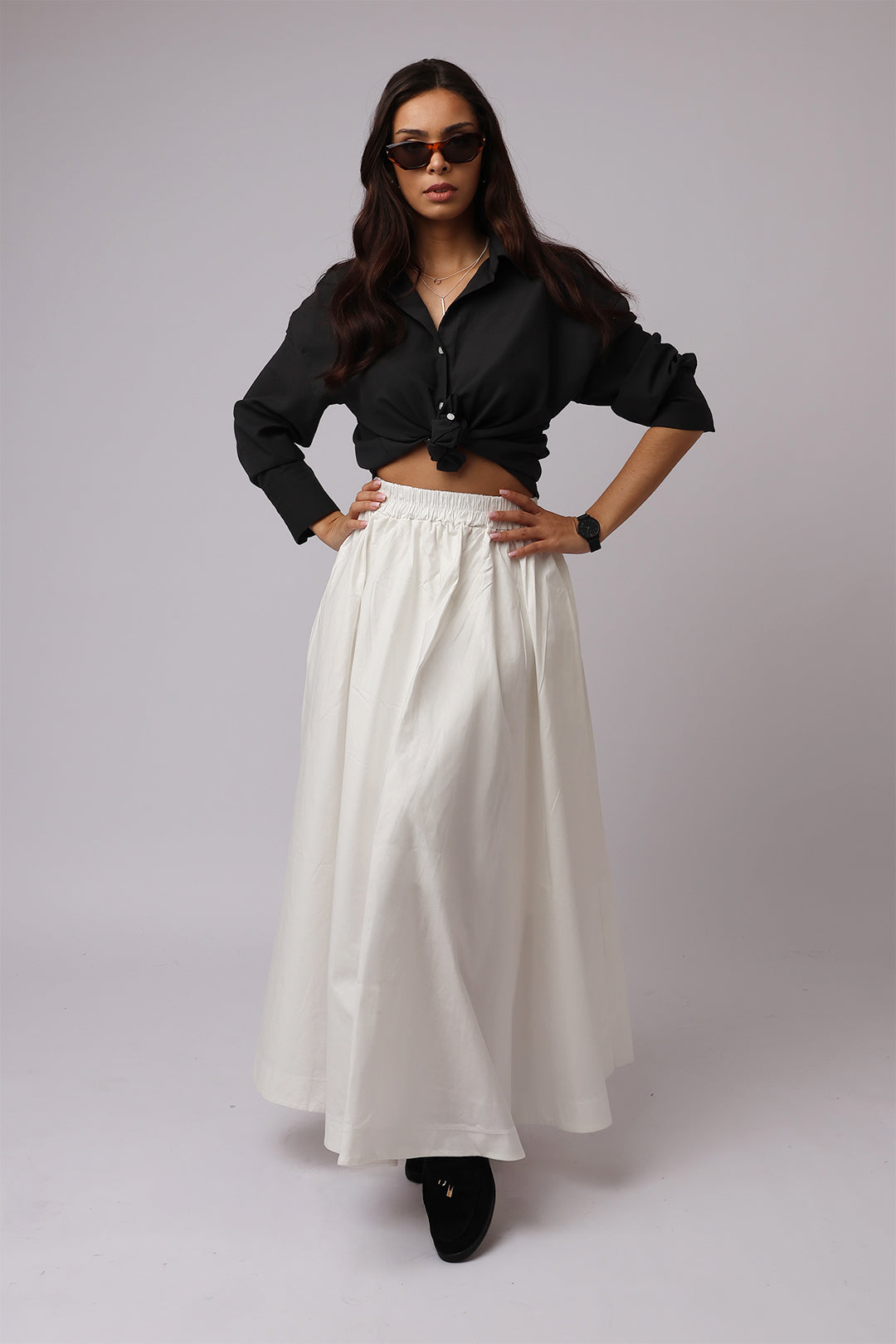 La version lumineuse de notre jupe fluide iconique, évoque la pureté d'un matin d'été. Confectionnée dans un coton léger à l'effet aérien, elle épouse le mouvement tout en offrant un confort absolu. À porter ceinturée, loose, ou rentrée, selon votre humeur