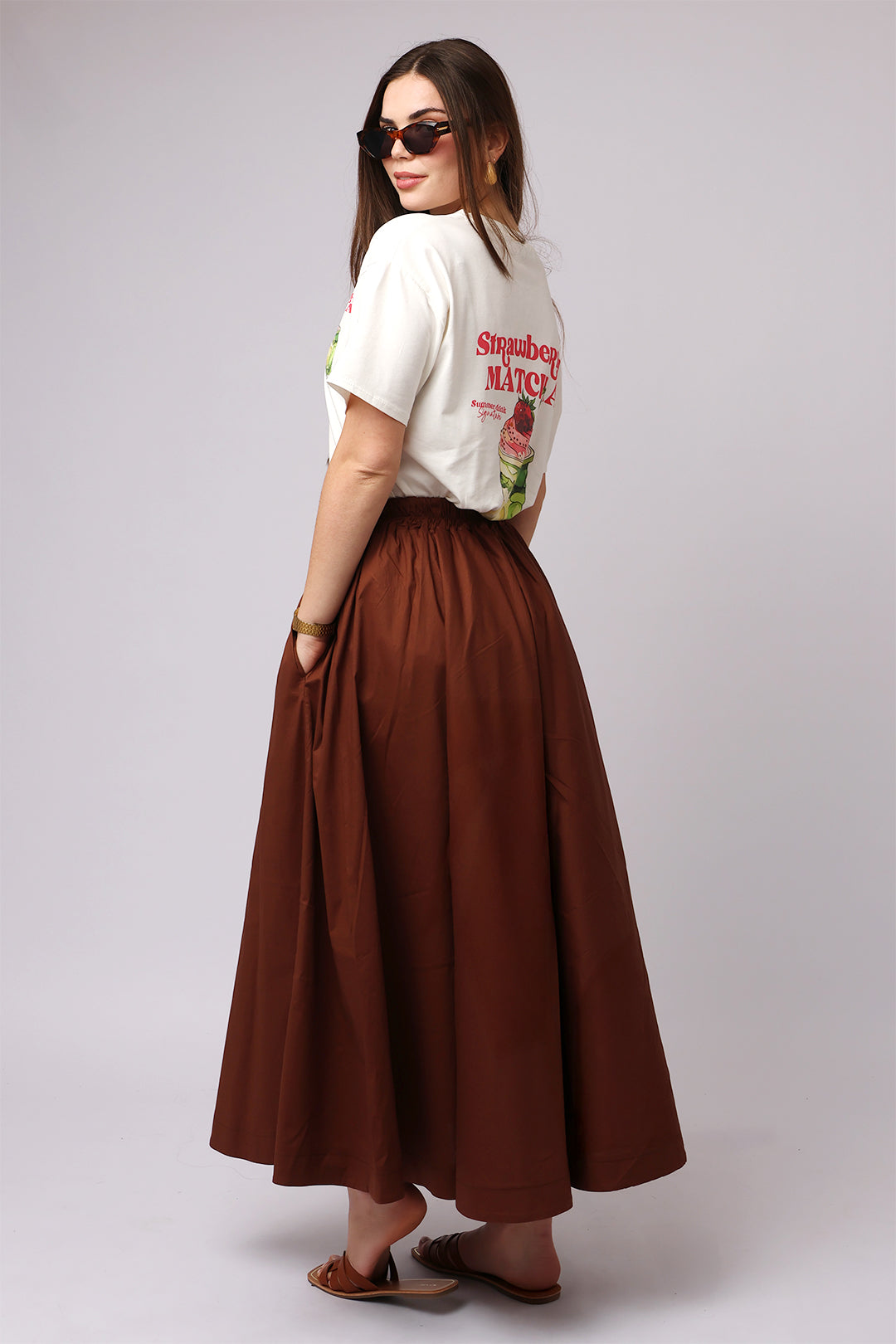Cette jupe longue à l'allure libre et raffinée, confectionnée dans un coton léger au tombé souple, elle offre un confort aérien tout en dessinant une silhouette fluide. Son coloris brun chaud évoque les terres toscanes et sublime toutes les carnations. À porter avec un top rentré, un t-shirt noué ou un débardeur près du corps pour un style naturel et élégant