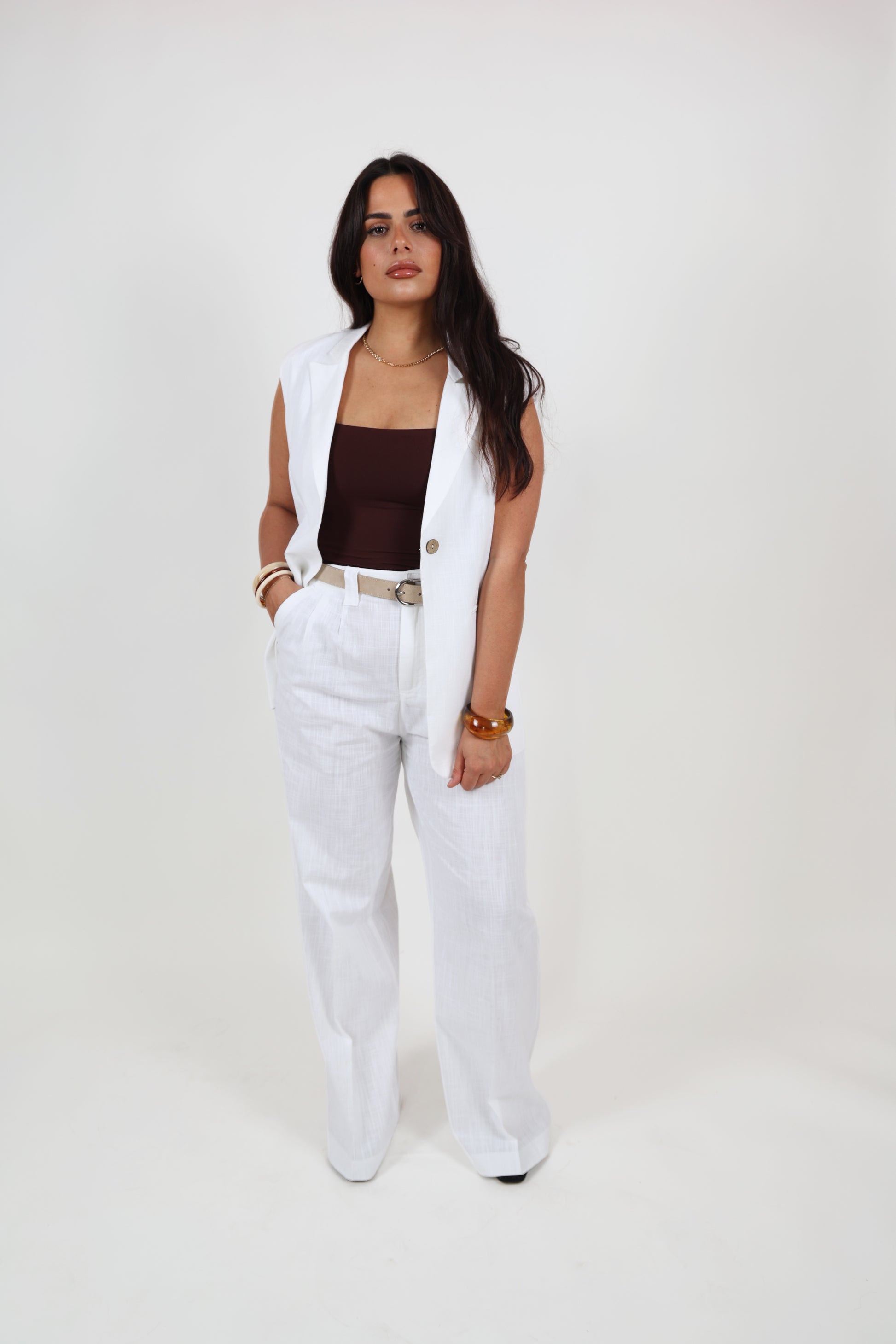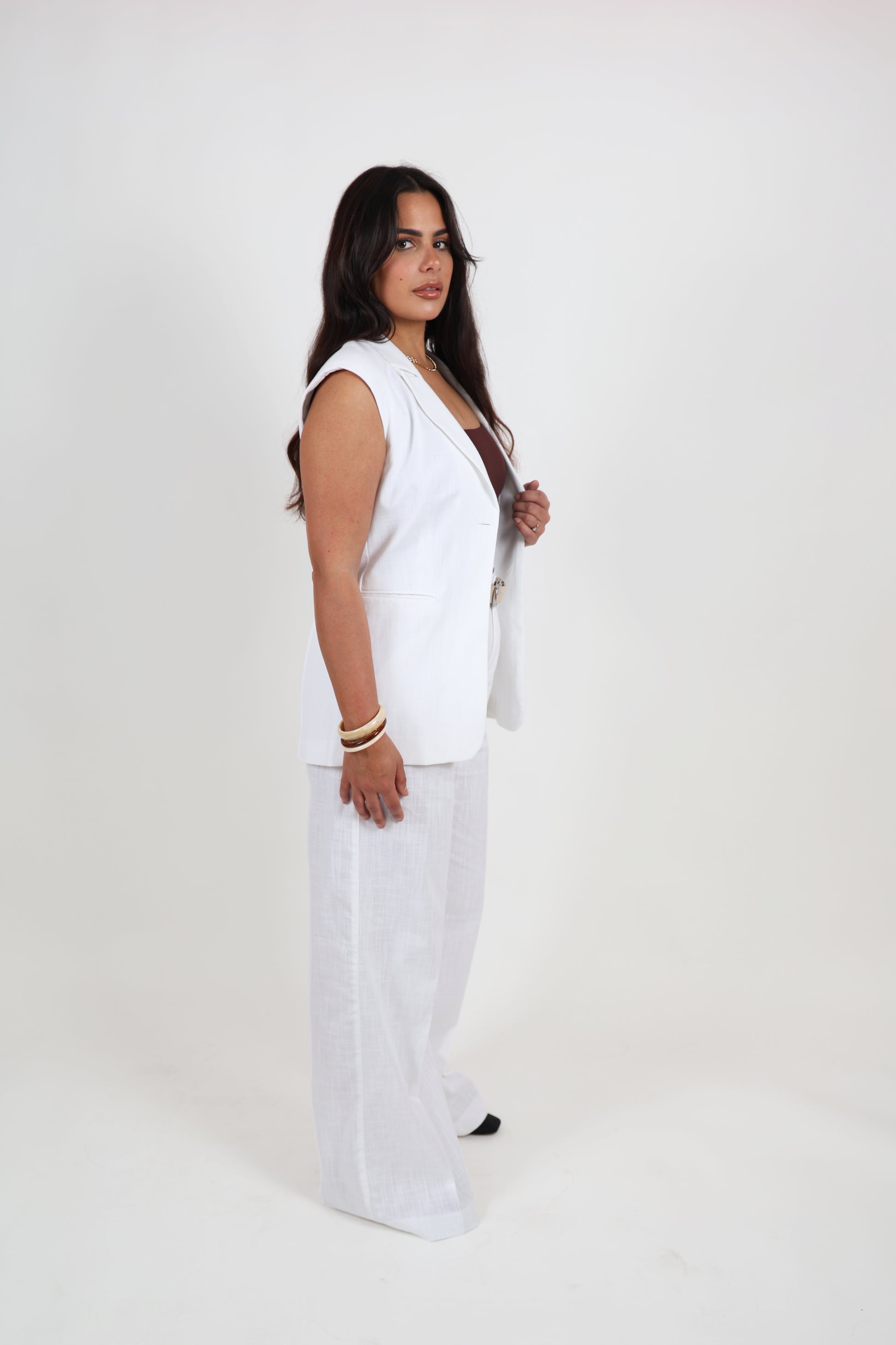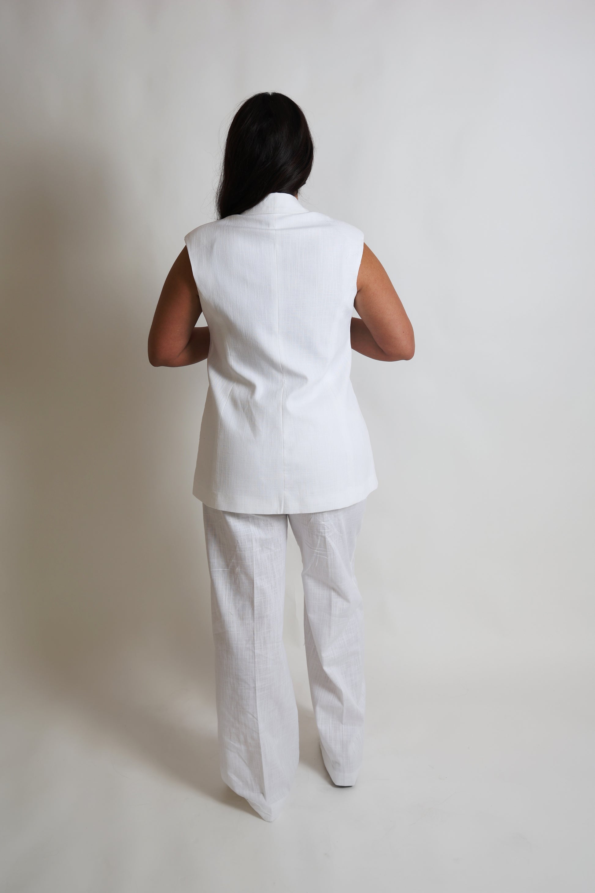 Ensemble blanc 100% Coton, ultra léger et respirant. Composé d'une veste sans manches et d'un pantalon coupe droite. Une tenue élégante et confortable, parfaite pour l'été.