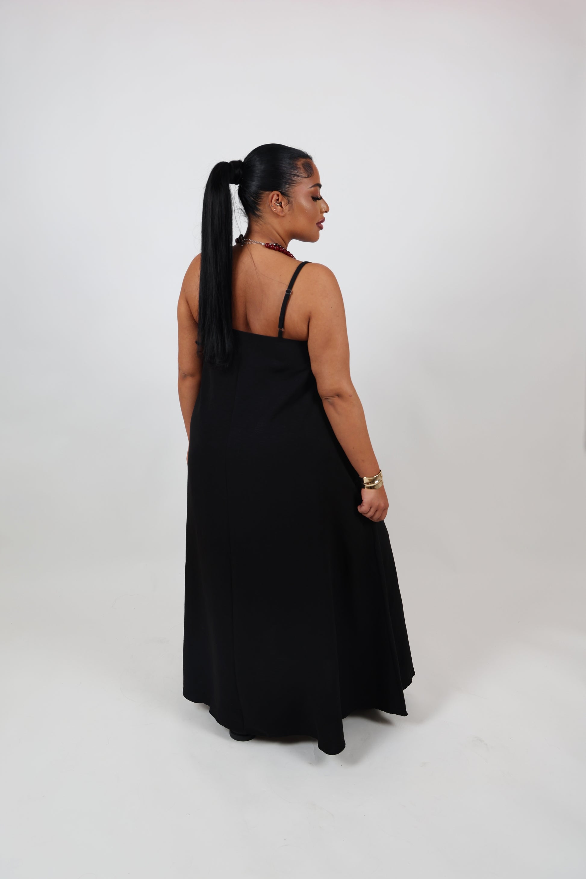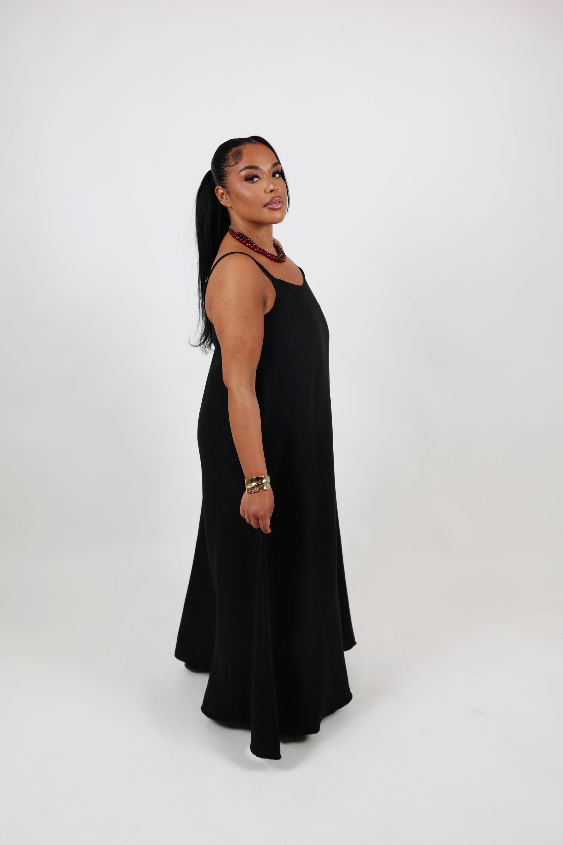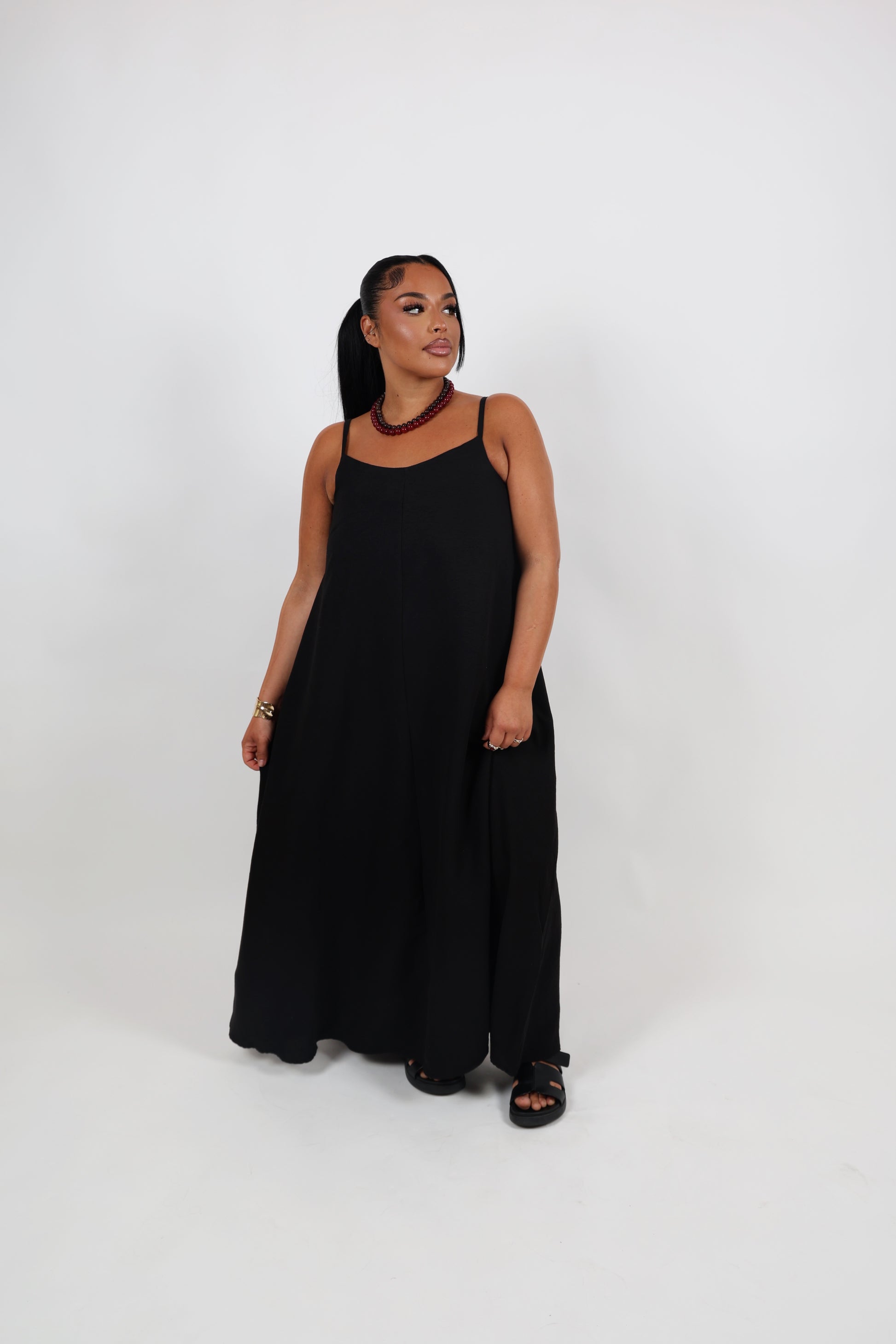 Robe longue noire, fluide et légère. Une pièce minimaliste, ultra confortable, parfaite pour les journées chaudes. bretelles fines, coupe ample et tissu doux sur la peau.