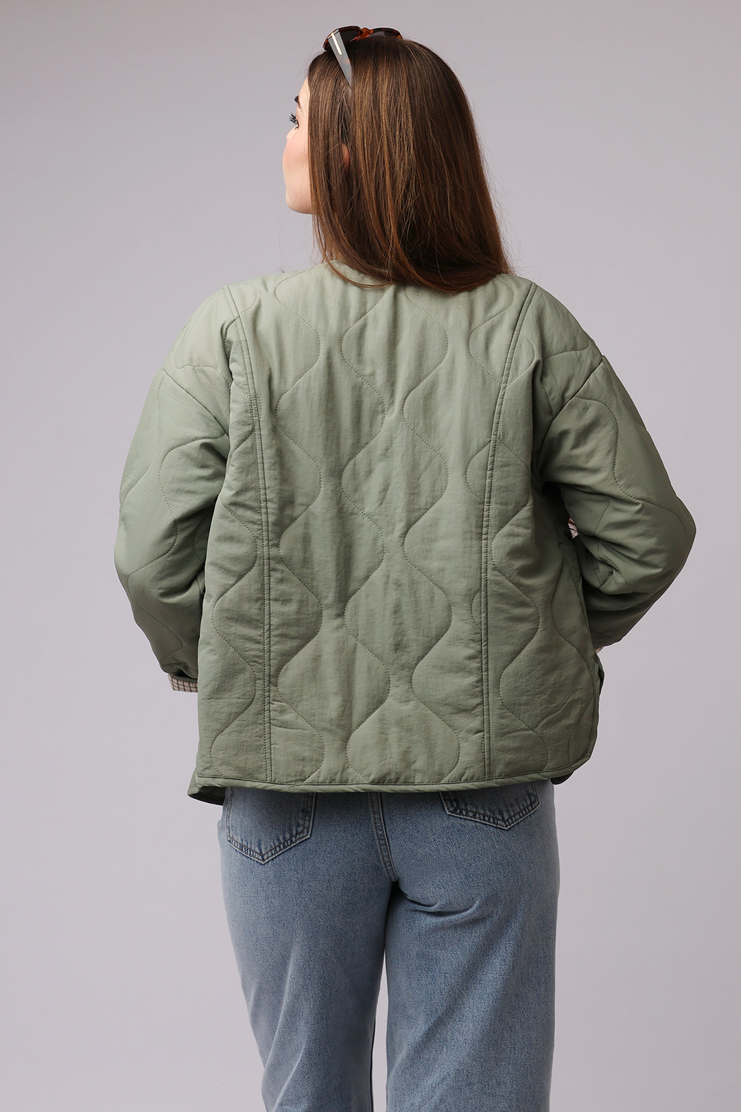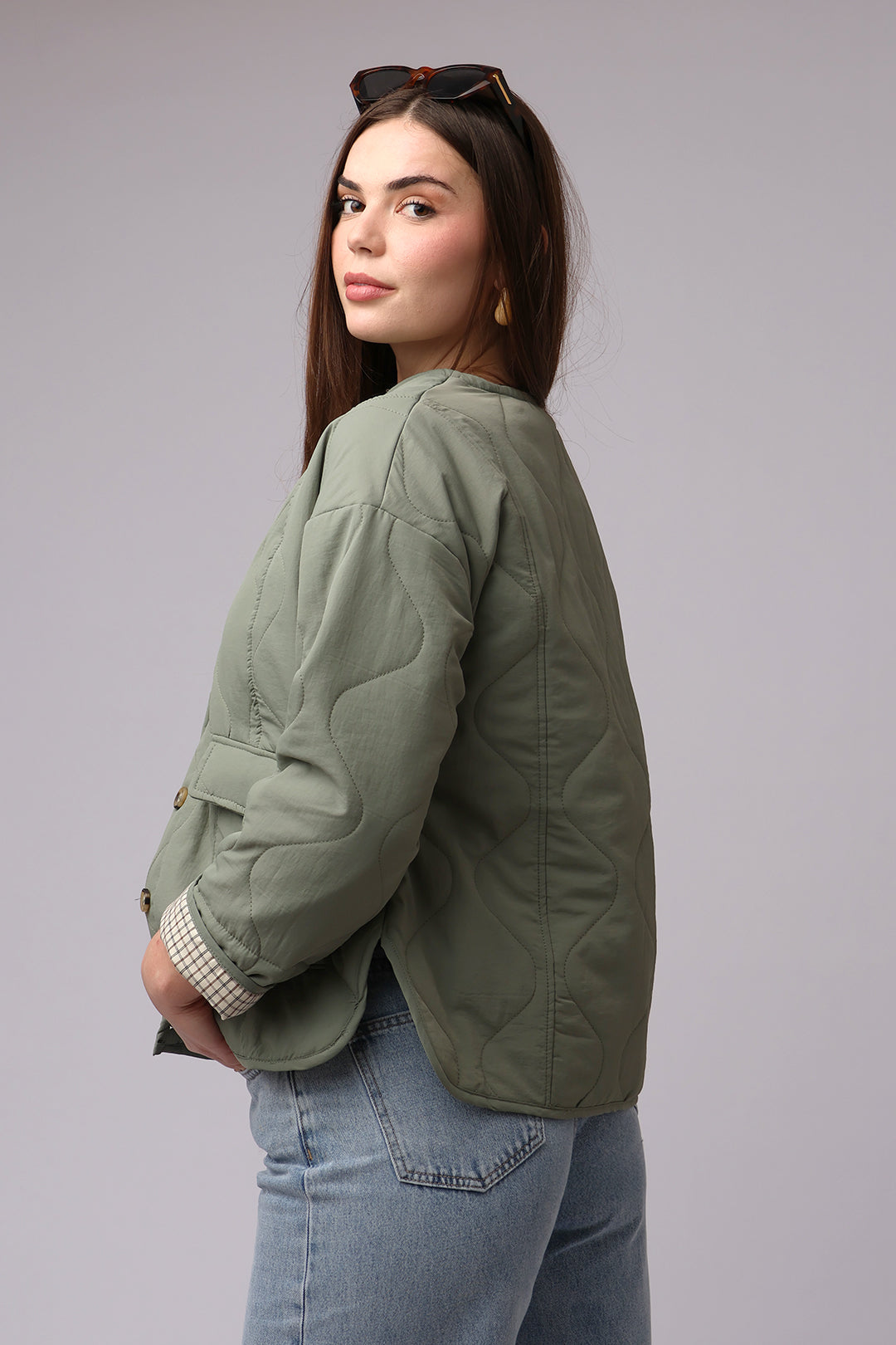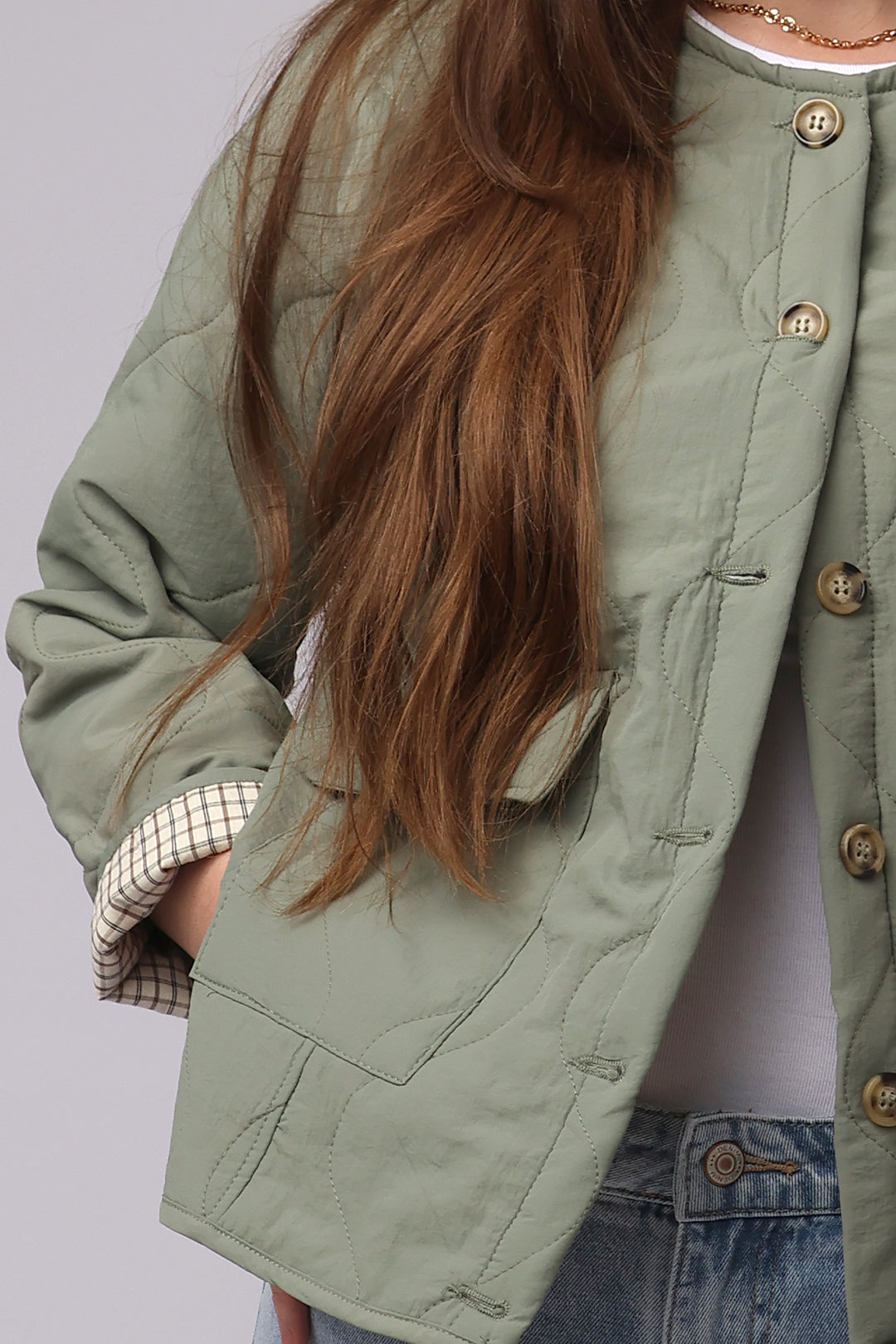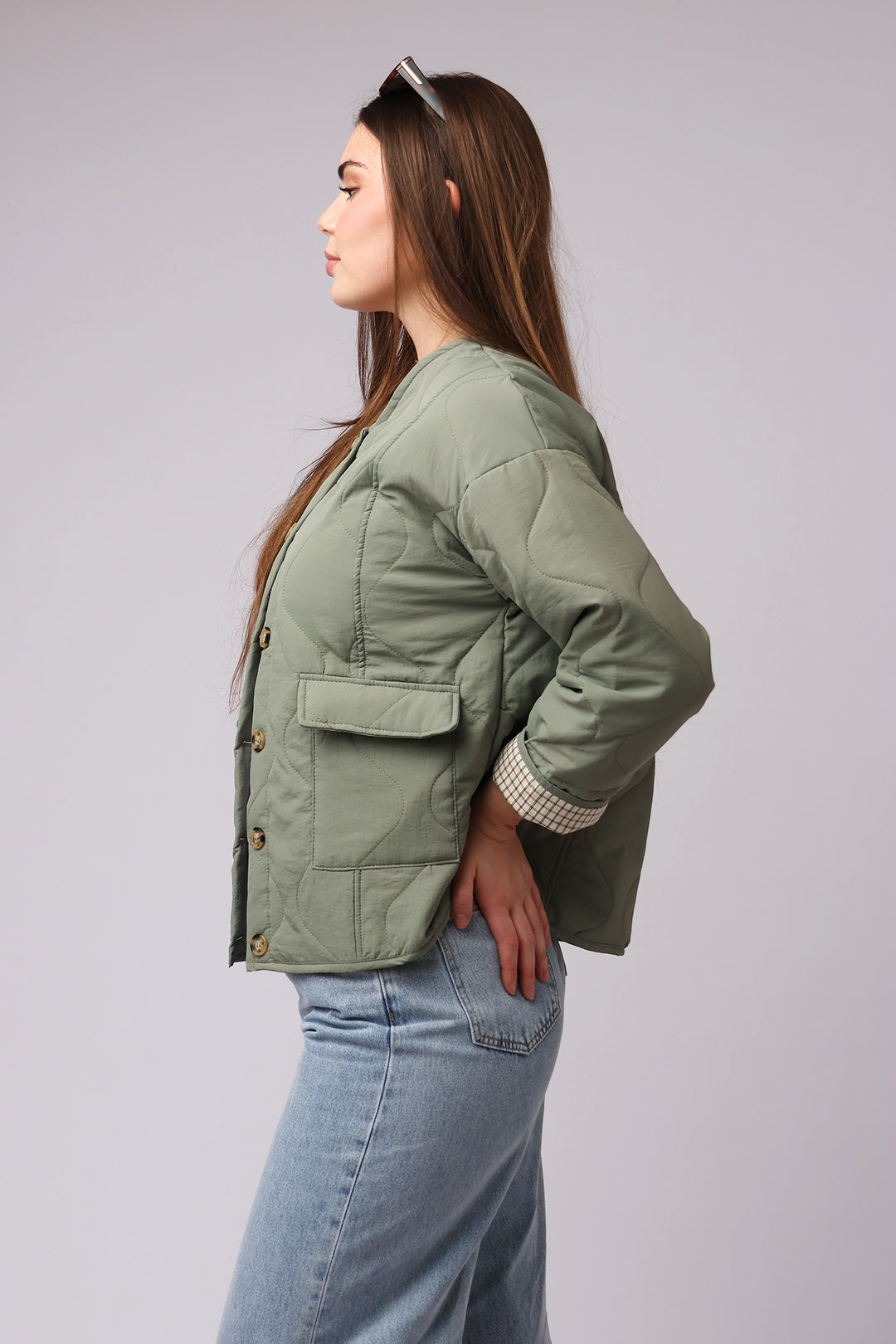 Parfaite pour la mi-saison, cette veste kaki légère est un incontournable pour un look à la fois décontracté et chic. Son tissu léger offre un confort optimal pour les journées printanières, tandis que sa doublure quadrillée apparente lorsque l’on plie les manches ajoute une touche de style subtil. Dotée d’un col rond et de deux poches pratiques, cette veste est idéale pour une tenue à la fois moderne et fonctionnelle.